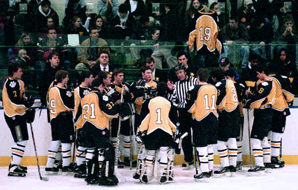 | Greg Uguccini's jersey is displayed behind the Heights bench. |