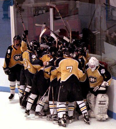 The Tigers celebrate their overtime win over University.