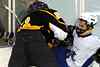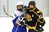| A Gilmour defenseman slows Ben Winger with a bear hug from behind. |