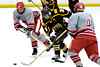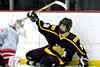 | Jeff Houser takes a Mentor Cardinal into the boards. |