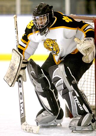 stands in goal for the Tigers.