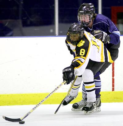 controls the puck while holding off a Kenston Bomber.