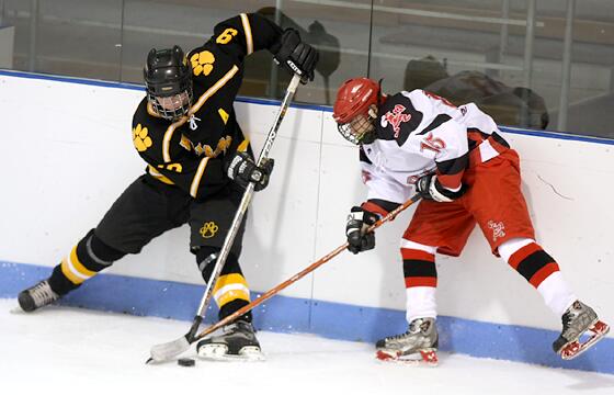 battles for the puck in the offensive zone.