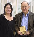 Sue Puletti, daughter of Rich Vojticek, presents the award to Doc McLaughlin