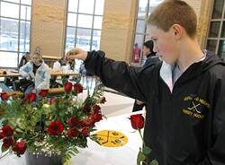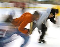 | Jeff Houser, Chris Matthews, John Sharpe and Nate Hall race down the ice. | Brandon Saylor selects a rose for Valentine's Day. |