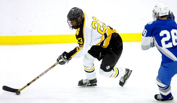 speeds past a defenseman on his way to the net.