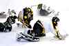 | Bodies go flying past Peter Eckendorf who covers the puck. |