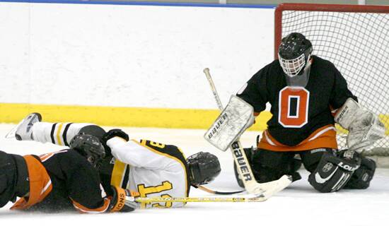 is tripped from behind, but he still puts the puck away.