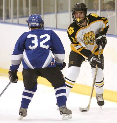 gets the puck out of the zone and prepares for a collision.