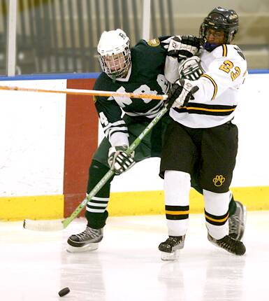 fights for a loose puck.