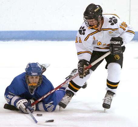 pulls the puck away from a Trinity Trojan.