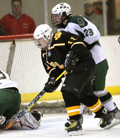 looks for the puck in front of the net.