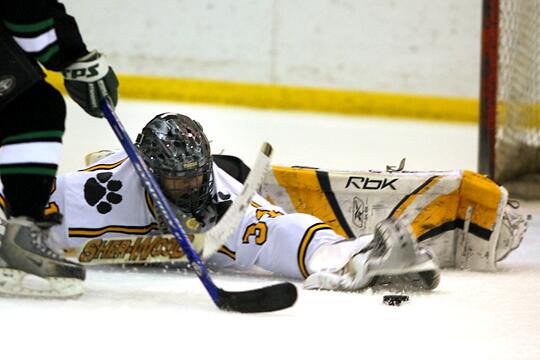 reaches to cover the puck.