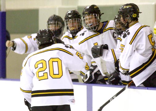 gets a warm welcome from the bench after scoring against Elyria Catholic.