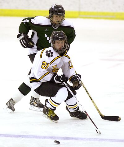 picks up the puck at the blue line.