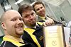 | Jordan Shoger jumps on Tyler Rudy after the winning goal. |