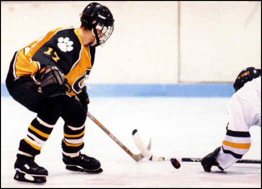 knocks the puck away from a St. Ignatius forward.